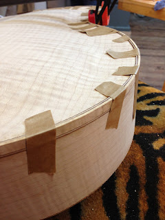 I also had a revelation that gave me hope that I'll be able to finish sooner than I thought I might. I was reminded that the process of lacquering should go much faster on this guitar than it did on the last one. The reason for it is that the process of lacquering the flat top involved spraying a coat of lacquer, allowing it to dry, then sanding it down so that the lacquer residue would fill the porous parts of the rosewood. But since we're using maple, which isn't nearly as porous, the filling is unnecessary. The process on the flat top took more than two months, so I'm hopeful I can save quite a bit of time.